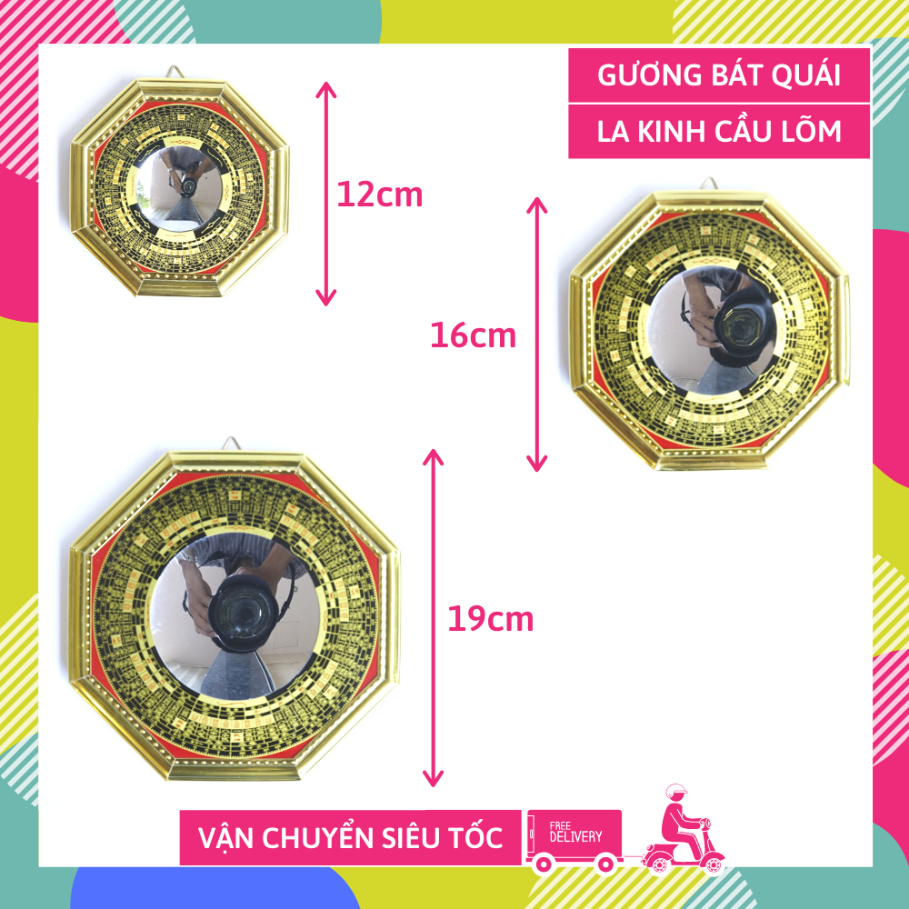 Các loại gương bát quái có tại Tâm Linh Số, bao gồm gương bát quái Âm Dương 12 Con Giáp, Hổ Phù 12 Con Giáp, La Kinh Lồi, La Kinh Lõm và Gỗ Lồi, Gỗ Lõm...Các kích thước đa dạng từ 12cm, 16cm và 19cm, 3 kích cỡ tốt cho mọi công trình, nhà ở, nhà xưởng để hóa giải phong thủy.