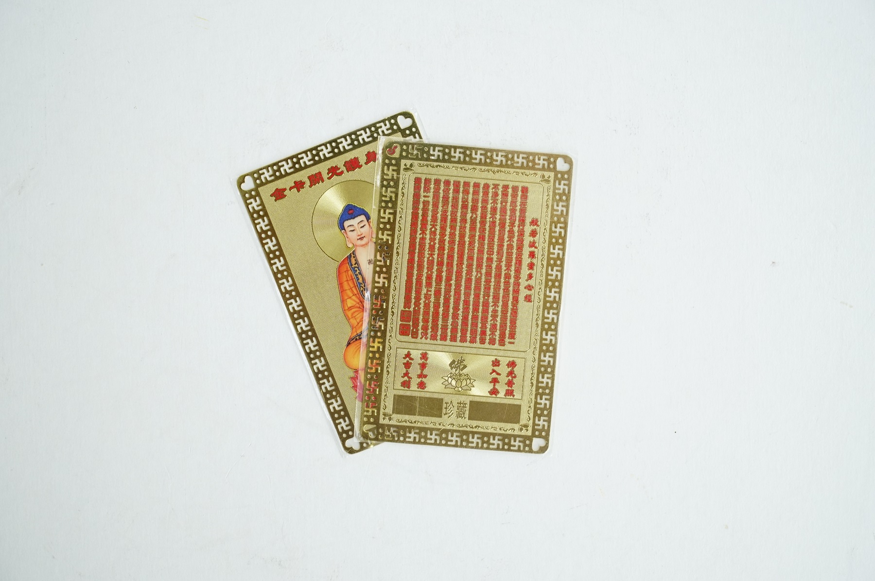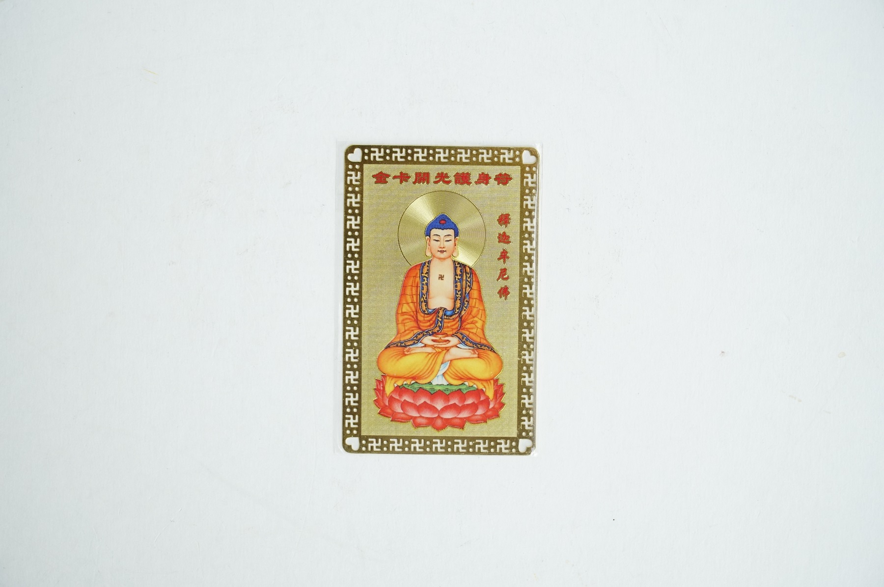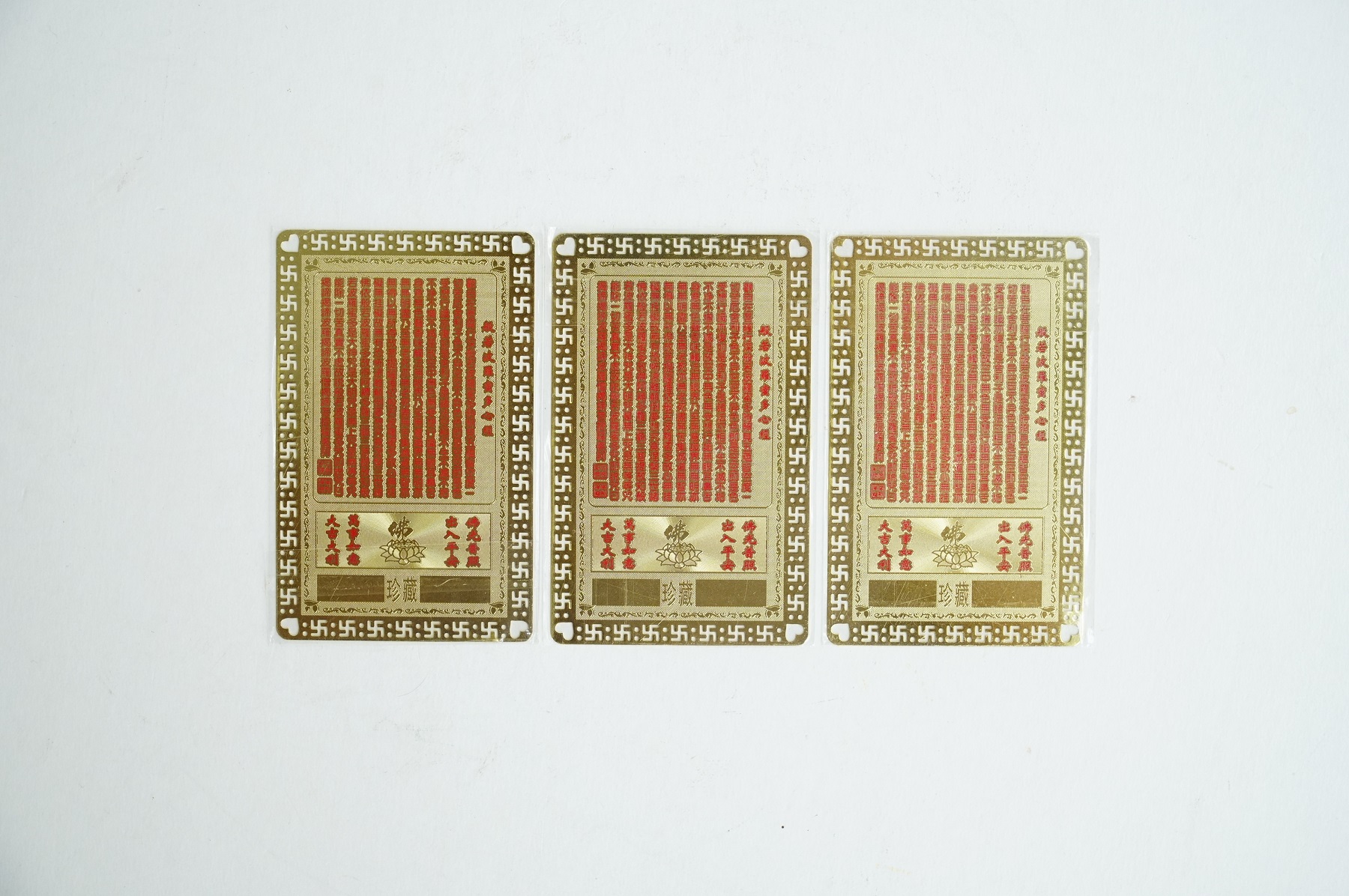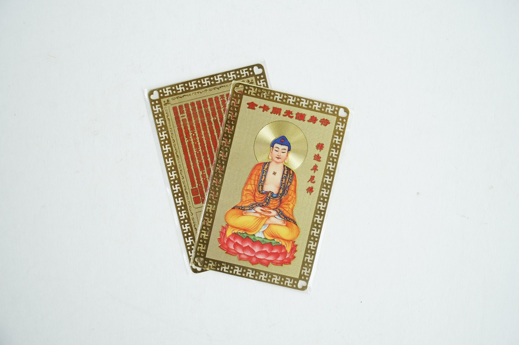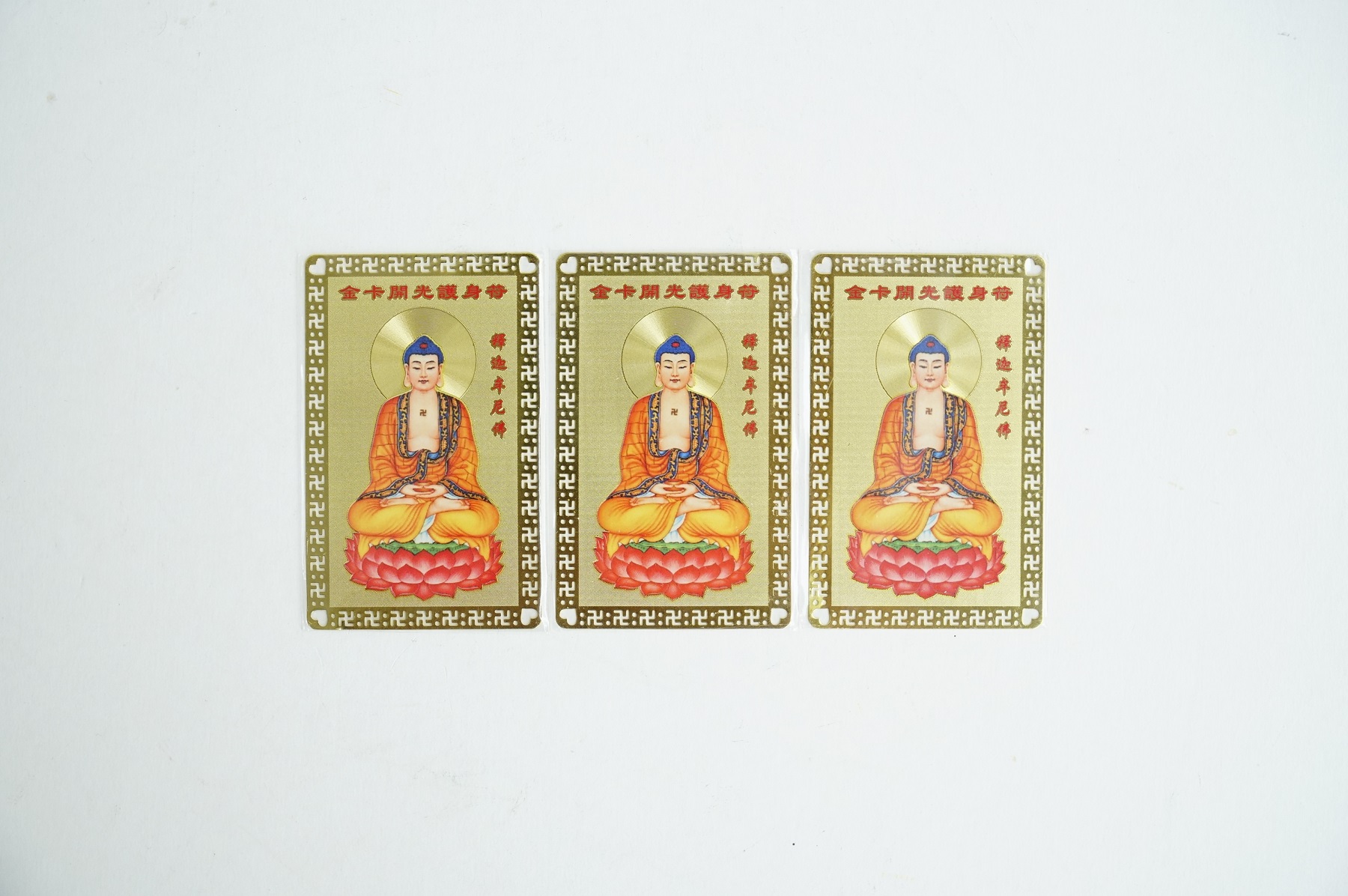 Miếng kinh chú Phật Thích Ca Mâu Ni Phật, Phật Quán Thế Âm Bồ Tát và Phật Di Lặc chất liệu Đồng Vàng cao cấp. Mặt trước là hình các vị Phật đang niệm chú, mặt sau là kinh chú các vị Phật.Mang tấm kinh chú theo trong người sẽ mang lại nhiều may mắn, bình an, sức khỏe, tài lộc, ngoài ra có thể sử dụng để làm quà tặng, đặt bàn thờ, làm lễ cúng đều rất là tốt.